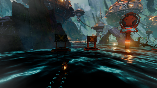Après avoir traversé les anneaux flamboyants, vous êtes censé prendre à droite. Au lieu de faire cela, continuez directement vers l’avant en dépassant les grandes bouées en forme de flèche pour vous rendre sur la rive. Le Robot-Espion se trouvera à proximité, à côté d’une torche, d’un chaudron et d’un téléporteur qui vous ramènera à votre navire. N’oubliez pas d’explorer cette zone pour trouver du Raritanium !