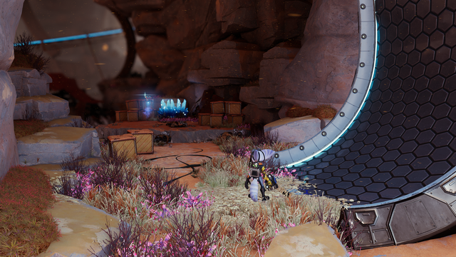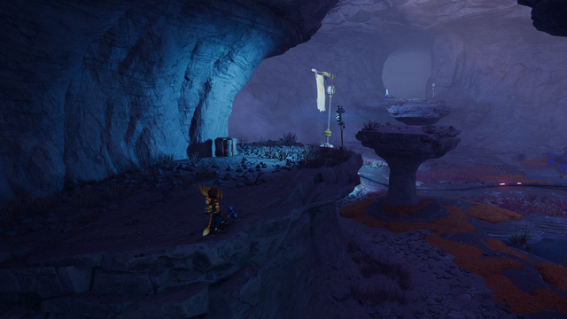 Ici, vous trouverez une bande de gravité que vous pouvez descendre. Battez les guêpes Fendersnax qui se présentent en chemin, puis continuez pour trouver le Robot-Espion dans la grotte du fond, sur une petite île dans une mare d’huile et accompagné de boîtes et de Raritanium.
