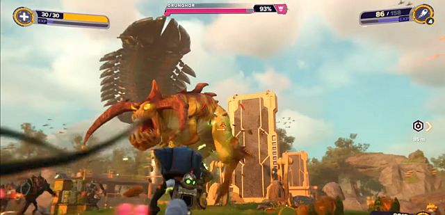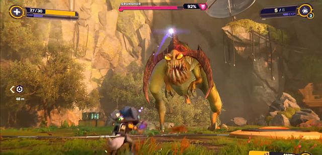 Bloquant le chemin vers la planque de Rivet, vous devrez tout d’abord vaincre le Grunghor qui patrouille dans la zone des verrous à pression. Heureusement, le Grunghor ne devrait pas être trop difficile car il n’a que deux attaques principales auxquelles vous devez faire attention :
