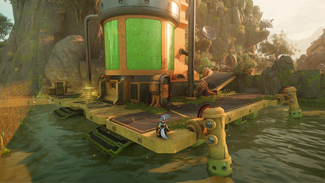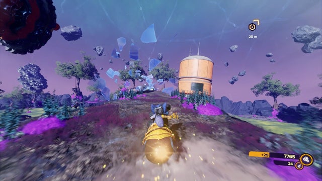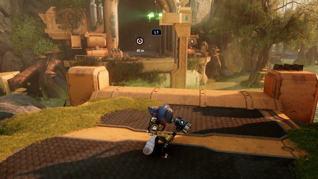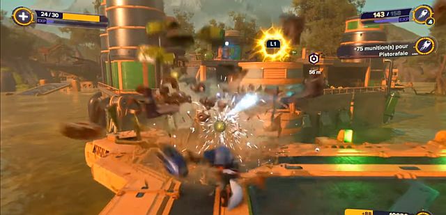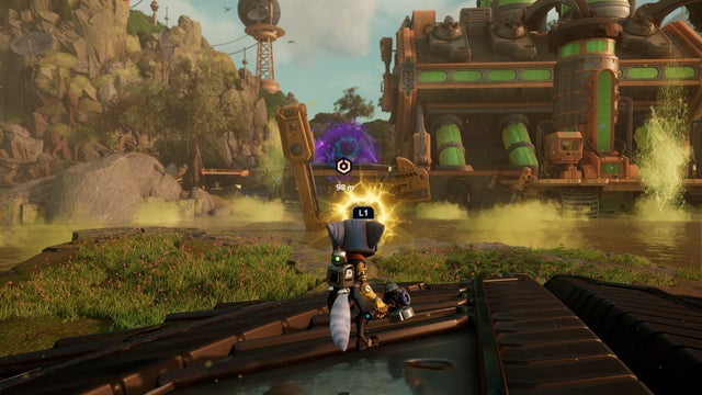 Le puzzle en lui-même consiste à utiliser soigneusement les lancers de Comet Strike pour lancer le marteau de Rivet dans les piles de boîtes flottantes afin de pouvoir ensuite sauter dessus. Nous vous recommandons vivement d’aller dans le menu des raccourcis d’accessibilité et d’affecter le lancer de mêlée au D-Pad : cela permet de lancer le marteau beaucoup plus rapidement.