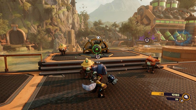 Une fois que vous êtes prêt à continuer, suivez le chemin juste à droite de Mme Zurkon en vous dirigeant vers le marqueur d’objectif. En arrivant au bout de la plateforme, vous verrez un Grunghor qui attaque un groupe de Goons-4-Less.