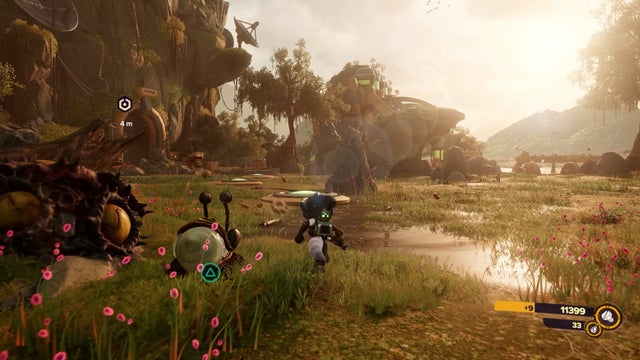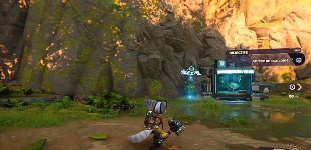 Après avoir rencontré le bot, continuez d’avancer et dérangez le nid scarapide en appuyant sur Carré. En dérangeant le nid, vous ferez apparaître un scarapide à proximité, que vous pourrez chevaucher en appuyant sur Triangle.