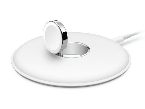 La station de charge magnétique est extrêmement élégante. Elle peut être utilisée pour charger l’Apple Watch à plat ou couchée sur le côté. Ce faisant, la montre passe automatiquement en mode alarme. La station de charge utilise le même connecteur de charge inductif que celui qui est également fourni avec l’Apple Watch.