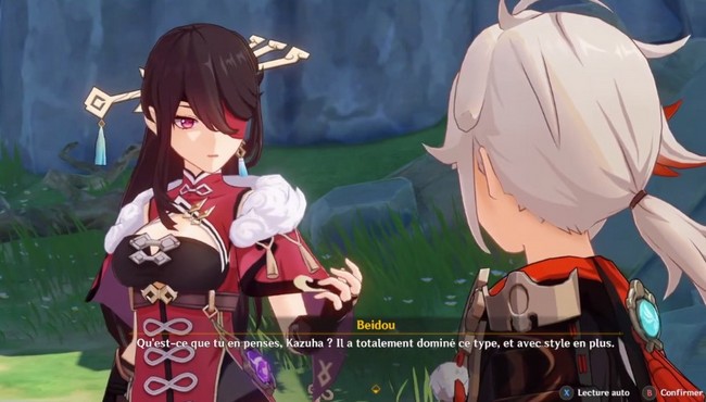 Vous retournez dans l’arène avec Kazuha à vos côtés, pour constater que votre concurrent est un peu en retard. Beidou essaie de gagner du temps en passant encore une fois en revue vos exploits.
