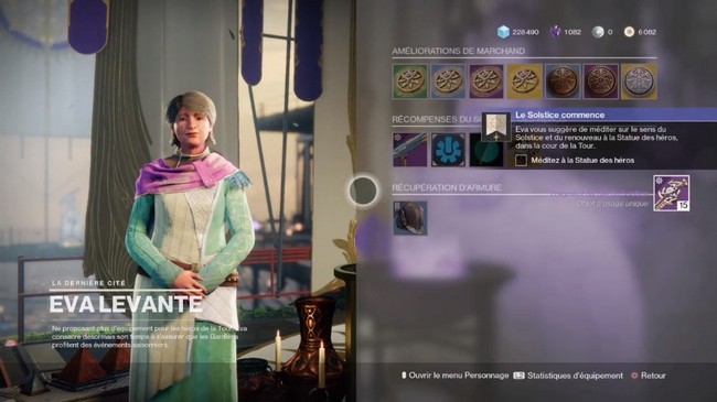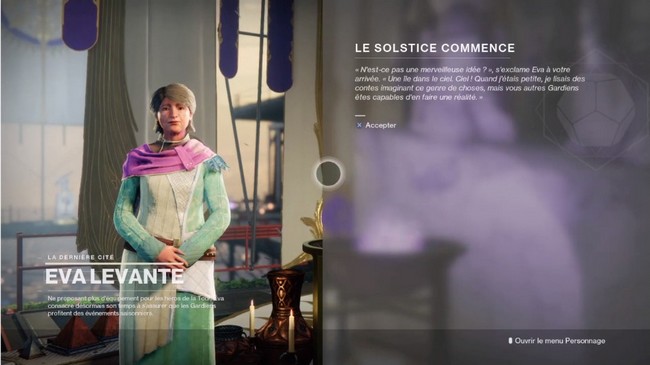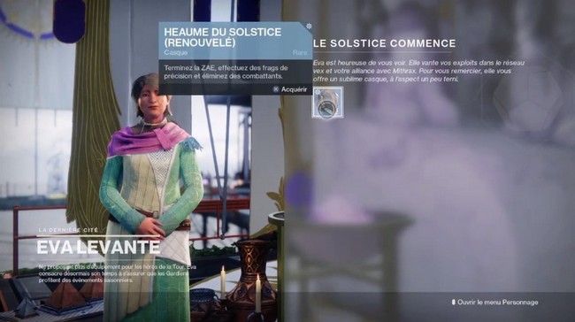 Pour commencer, rendez-vous à la Tour et rencontrez Eva Levante. Après lui avoir remis votre premier casque Heaume du solstice (renouvelé), elle vous demandera de commencer votre première quête “le Solstice commence” dans la zone aérienne européenne qui est la première partie de l’événement.