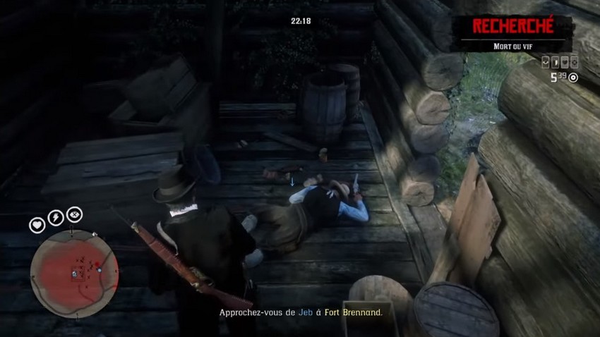 Jeb se fera tirer dessus pendant le combat, puis c’est à vous de trouver la cachette. Vous pourrez la trouver sous les escaliers, à l’intérieur du fort.