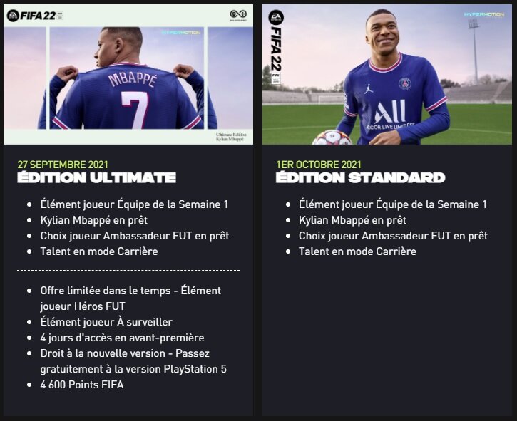 Il existe actuellement deux versions de FIFA 22 : l’édition standard et l’édition ultimate qui vous permet de bénéficier d’une date de sortie anticipée et de quelques extras.