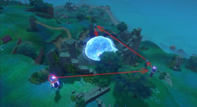 La première énigme des pylônes commence directement à votre gauche après avoir communiqué avec la lanterne de pierre. Vous devrez vous approcher de chaque pylône pour changer son orientation ou son altitude. Le but est de créer un courant où la boule électrique peut descendre la chaîne et finir par frapper la grande barrière d’eau sphérique plus loin sur la pente. La trajectoire que vous devez faire suivre à la grosse bulle d’eau est la suivante.