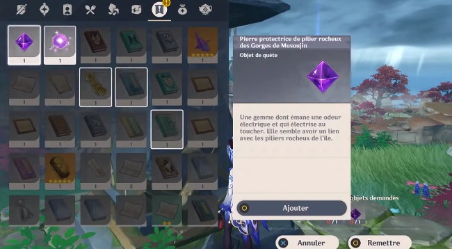 Au fond du puits, vous serez arrêté par un autre ennemi que vous devrez vaincre. Au bord de l’arène, vous trouverez une autre pierre violette (Pierre protectrice de pilier rocheux des gorges de Musoujin). Ramassez-la.