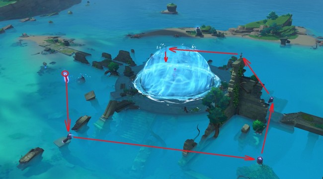 Le puzzle des piliers est assez simple et similaire à celui de la précédente quête. Vous devez simplement lier les pylônes de gauche à droite pour faire tout le tour du dôme.