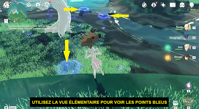 Une fois que vous avez trouvé une arbre de cerisier tonnerre, utilisez la vue élémentaire pour voir quelques points bleus sur le sol près des arbres, comme le montre l’image ci-dessous. Si vous vous tenez sur un point bleu, la foudre frappera ce point. Placez-vous sur tous les points bleus et faites en sorte que la foudre les frappe. Lorsque la foudre a frappé tous les points bleus, des fleurs vont commencer à fleurir sur l’arbre de cerisier tonnerre. Maintenant, approchez-vous de l’arbre et récupérez l’objet étranger qui s’y trouve (voir l’image ci-dessous).