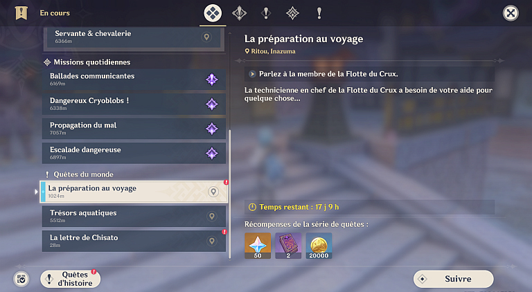 La préparation au voyage est la quête de déblocage de l’événement Fracas du tonnerre à Inazuma ! Une fois que vous avez terminé La préparation au voyage, vous pouvez commencer à jouer aux étapes et aux défis de Fracas du tonnerre.