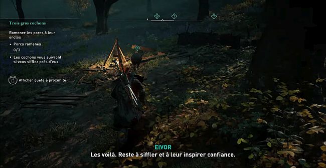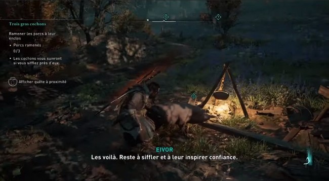 Il y a trois cochons que vous devez trouver dans la forêt. Lorsque vous les atteignez, cliquez sur le bouton que vous utiliseriez pour invoquer votre monture, mais plutôt que de maintenir ce bouton, cliquez simplement dessus pour Eivor lance Un sifflement. Cela fera siffler Eivor et attirera les cochons vers sa position.