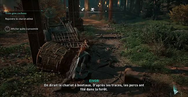 Le chariot de cochons accidenté se trouvera à environ 60 mètres de la position de Braun, au nord. Quand Eivor arrivera là-bas, il remarquera les traces sur le sol et fera remarquer que les cochons se sont enfuis dans la forêt. Vous pouvez utiliser votre corbeau pour les trouver, et lorsque vous atteignez un cochon, il vous suffit de siffler pour qu’il vous suive chez vous.