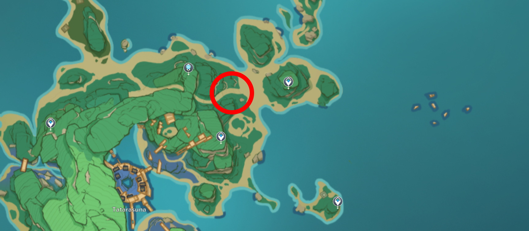 Chouji promet au joueur « un coffre plein de trésors » après avoir extrait pour lui 12 moelles cristallines. L’emplacement de ce trésor se trouve près de la mine de Jakotsu, au sud de l’île Yashiori. Près de la falaise orientale, il y a une petite statue en forme de boussole à côté d’un seul arbre. Le trésor peut être trouvé dans les buissons derrière cet arbre.