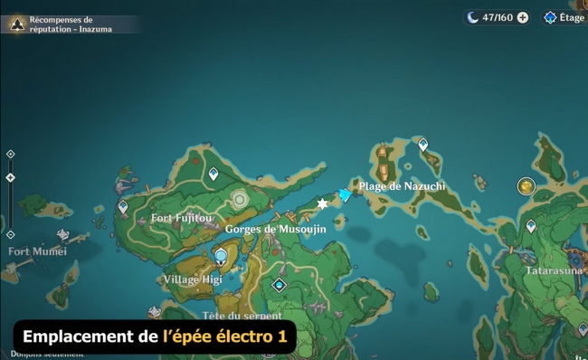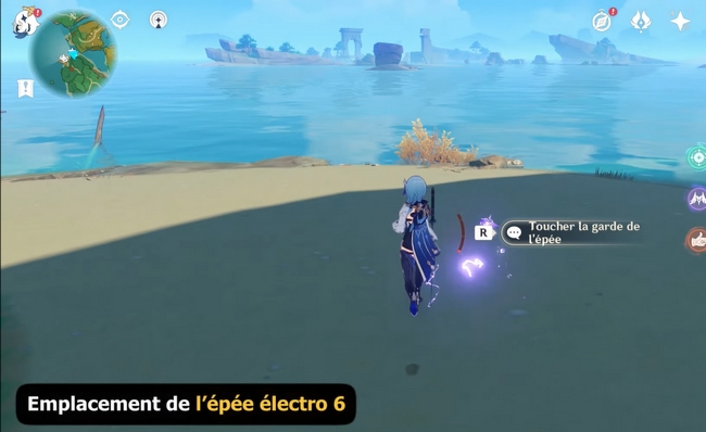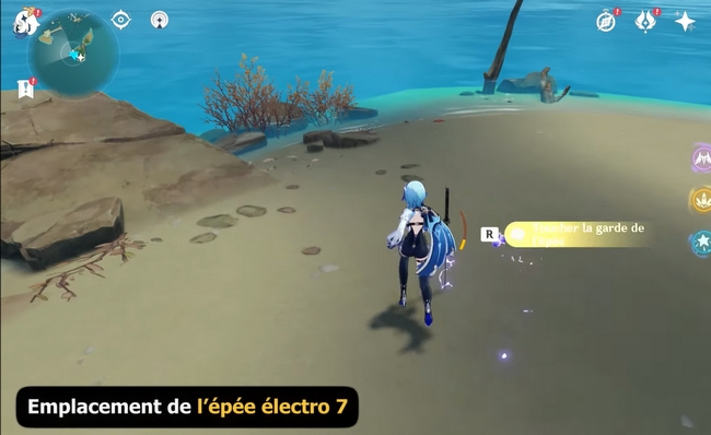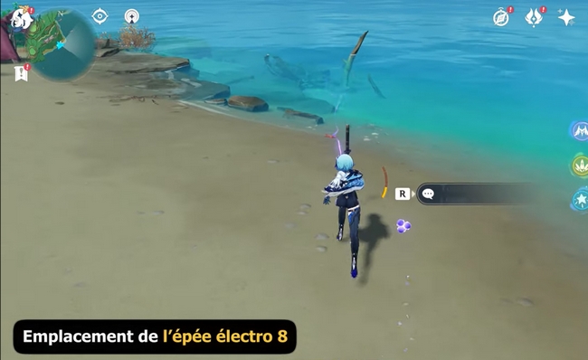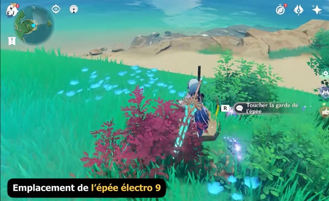 L’épée se trouve sur la plage de Nazuchi, au nord-est de l’île Yashiori. Le manche de l’épée se trouve à l’endroit indiqué sur l’image ci-dessus. Invoquez un electrogranum, puis touchez l’épée pour faire apparaître un samouraï d’élite. Battez le samouraï et un coffre commun apparaîtra.