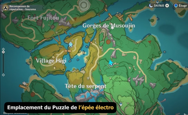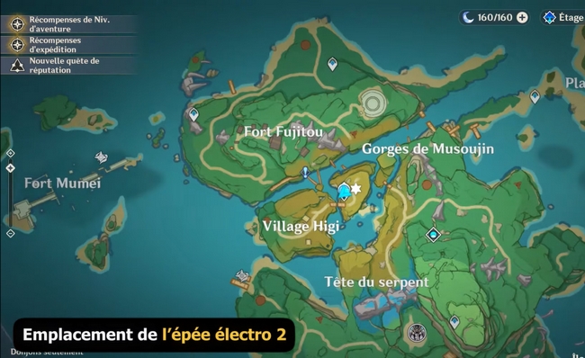 L’épée se trouve dans les gorges de Musoujin, comme le montre l’image ci-dessus. Vous y trouverez six épées électro en cercle et un coffre luxueux au centre du cercle.
