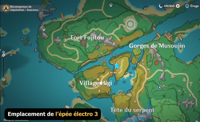 L’épée se trouve sur le côté nord du Fort Fojitou de l’île Yashiori, à l’endroit indiqué sur l’image ci-dessus. Invoquez un electrogranum, puis touchez la poignée de l’épée pour faire apparaître un samouraï d’élite. Battez le samouraï et un coffre ordinaire apparaîtra.