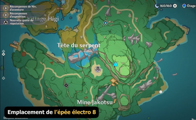 L’épée se trouve à l’ouest de Tête du serpent, à l’endroit indiqué sur l’image ci-dessus. Invoquez un electrogranum, puis touchez la poignée de l’épée pour faire apparaître un samouraï d’élite. Battez le samouraï et un coffre ordinaire apparaîtra.