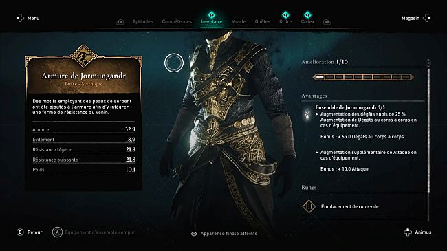 Des motifs employant des peaux de serpent ont été ajoutés à l’armure afin d’y intégrer une forme de résistance au venin.