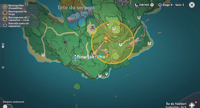 Ensuite, dirigez-vous vers la mine Jakotsu. L’indicateur de zone comprend une large bande autour du point de téléportation, mais votre objectif est autour du dôme d’eau géant (ou de la zone où il se trouvait, si vous avez déjà terminé le Rituel de purification du cerisier sacré, là où se trouvait le dôme). Descendez au niveau inférieur et la Fée chercheuse vous guidera vers les trésors. Ils sont tous proches les uns des autres cette fois, et aucune surprise ennemie ne vous attend.