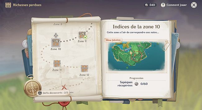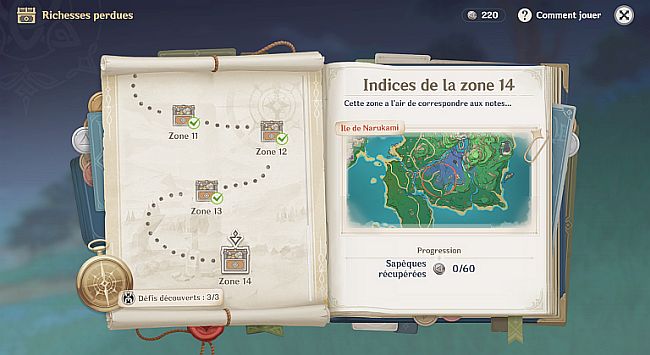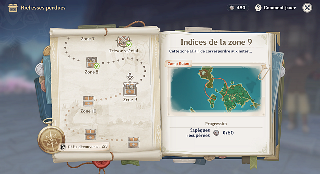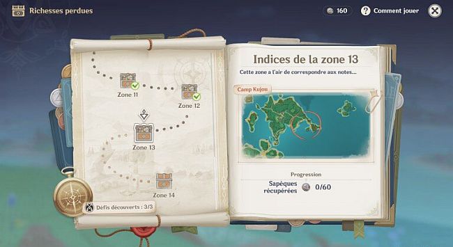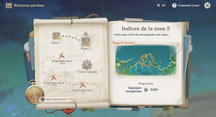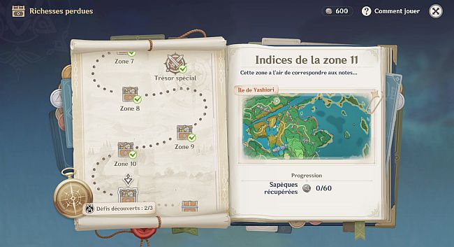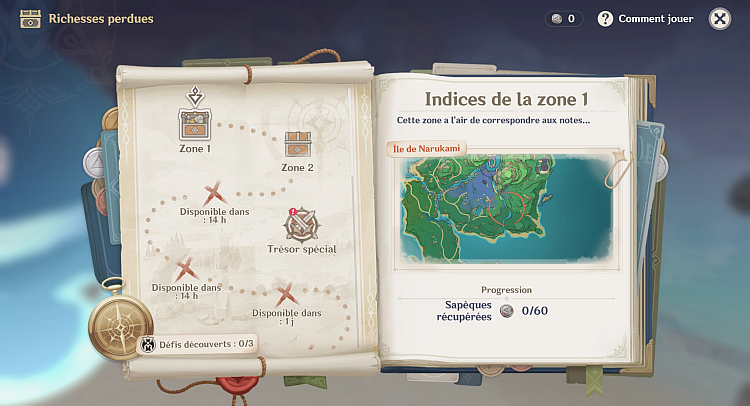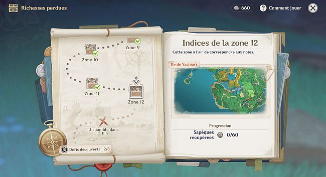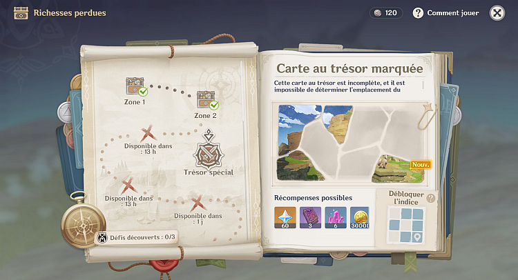 Il y a 14 zones de trésors, avec 2 nouvelles zones par jour. En plus de ces 14 zones, il y aura également 2 zones de trésors secrets. Résoudre ces zones en vaut vraiment la peine, car chacune d’entre elles vous permettra d’obtenir 60 Primo-gemmes et d’autres récompenses.