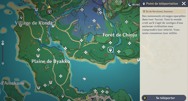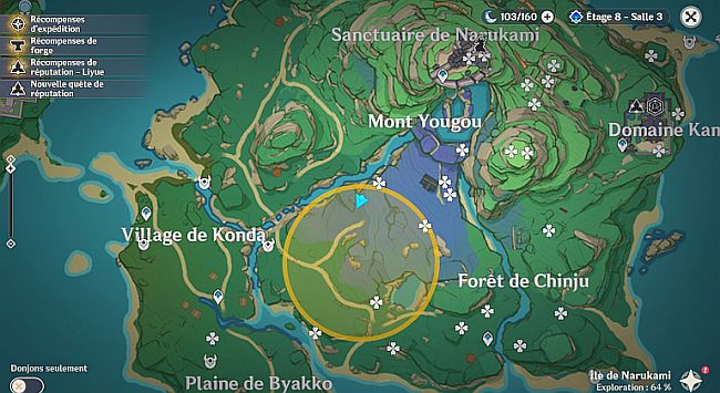 Le premier trésor spécial se trouve sur l’île de Narukami. Téléportez-vous à la Forêt de Chinju. Utilisez la Fée chercheuse pour trouver l’emplacement ou creuser. Faites-le jusqu’à arriver à 60 sapèques pour compléter la zone.