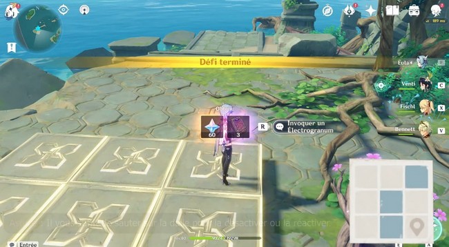 La première zone de trésor spécial est à Araumi. Téléportez-vous donc jusqu’au point de téléportation qui s’y trouve et dirigez-vous vers le nord-est. Une fois que vous êtes dans la bonne zone, vous recevrez une notification qui vous informera que vous êtes près du trésor secret. De même, elle vous invitera à vous débarrasser de votre Fée chercheuse en quête de trésor. C’est ce que vous devez faire : sélectionnez la Fée chercheuse dans l’onglet de votre inventaire de gadgets et équipez-la. La Fée chercheuse vous guidera vers un endroit où vous devrez creuser. Une fois que vous l’aurez fait, vous déterrerez un mécanisme spécial. Marchez dessus et le puzzle commencera. Pour résoudre cette énigme, vous devez marcher sur les dalles et les allumer en fonction de votre propre indice d’énigme (dans le coin inférieur droit).