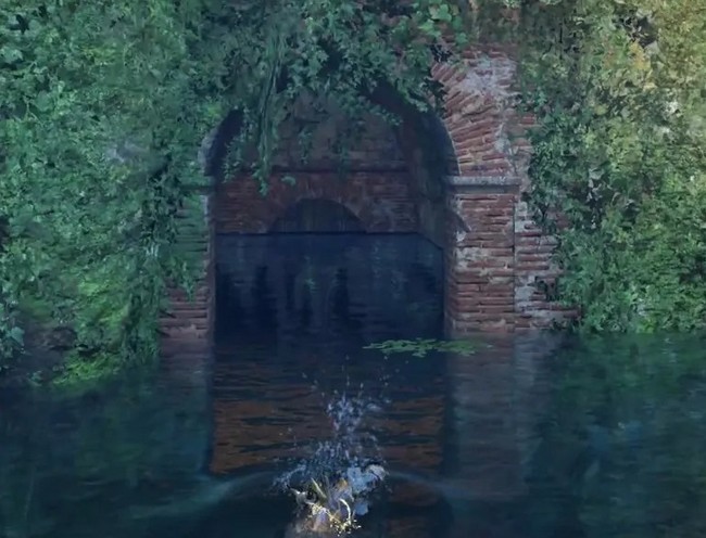 Sur le côté sud de la colline, vous trouverez un lac. Sautez dedans et nagez vers le nord jusqu’à ce que vous entriez dans les ruines.