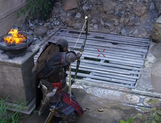 Près de la tente rouge parmi les ruines, cherchez le plancher en bois que vous pouvez briser avec une flèche pour révéler l’entrée cachée en dessous.