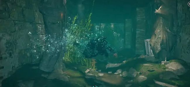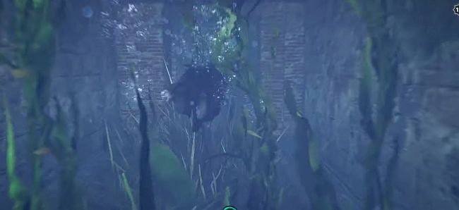Nagez à travers l’arche et montez pour trouver une porte en pierre avec le symbole Ceux qu’on ne voit pas. Interagissez avec pour l’ouvrir. Traversez et descendez dans l’eau, plongez pour passer sous une autre arche.