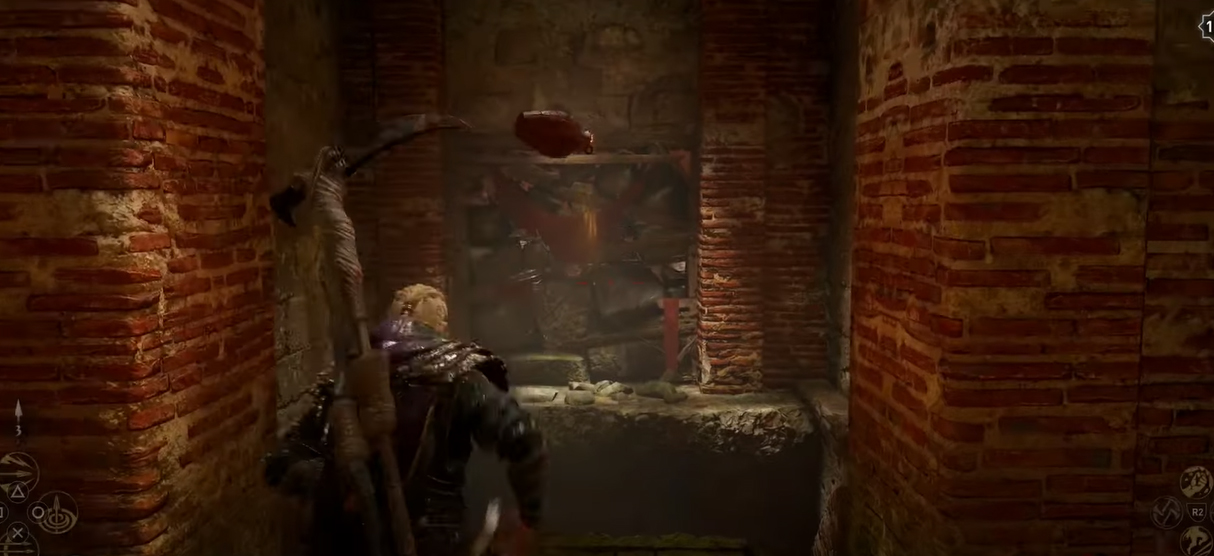Suivez le chemin linéaire jusqu’à ce que vous puissiez grimper et atteindre une zone avec des pots d’huile et un mur cassable. Ramassez un bocal et jetez-le sur le mur pour le briser. Traversez et récupérez la clé.