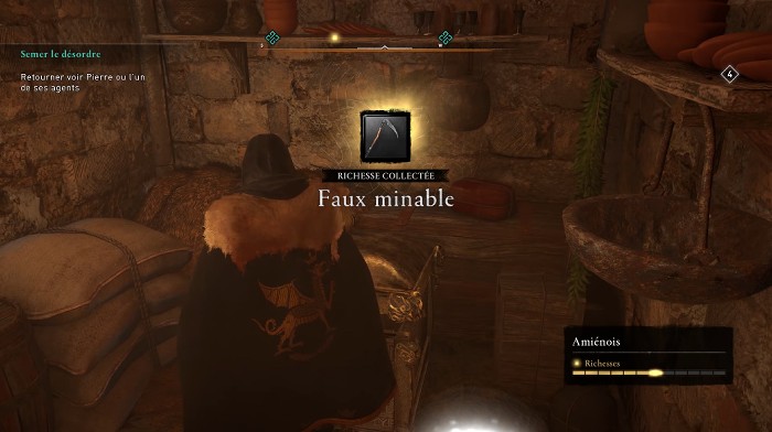 Après vous être débarrassé des rats et avoir déplacé l’étagère, vous trouverez une petite pièce. Entrez dans cette pièce et pillez le coffre qui s’y trouve. Une fois que vous l’aurez fait, la richesse Amiénois sera marquée comme collectée. En faisant cela, vous obtiendrez le Faux minable.