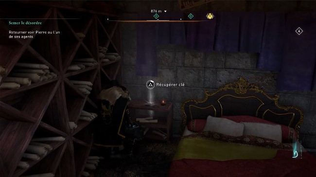 Si vous voulez être absolument sûr d’être au bon endroit, cherchez un lit bleues comme dans l’image en dessus. Une fois que vous avez atteint le manoir, allez au deuxième étage. Ici, vous trouverez la Clé de porte de Murmiliacum sur une table à côté du lit.