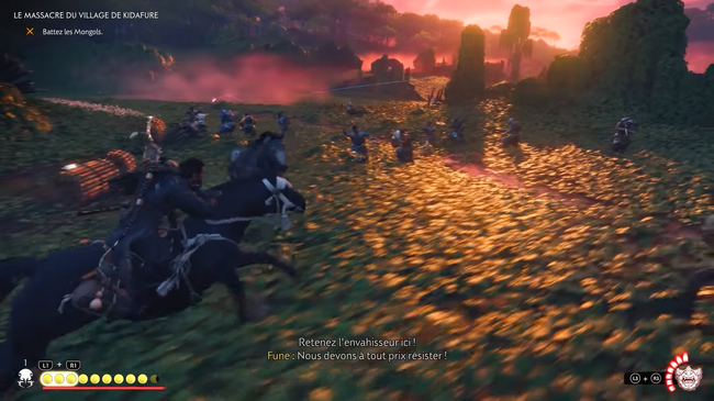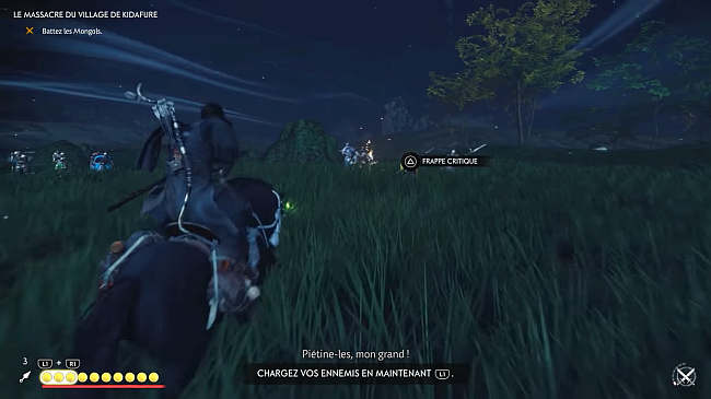 Utilisez la compétence de charge de votre cheval et écrasez certains des ennemis, avant de descendre du cheval et d’affronter les ennemis restants. Vérifiez les chamanes sur les rochers en arrière-plan et essayez de vous en débarrasser, pour affaiblir les autres Mongols.