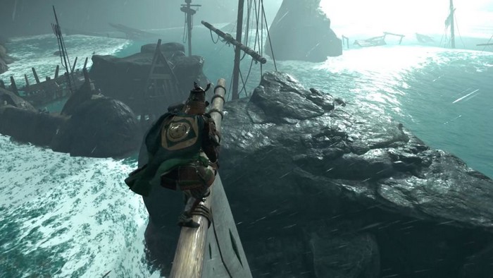 Dans le coin avant droit de la proue se trouve une corde qui mène au sommet des voiles du bateau suivant. Traversez-la, puis sautez sur la corde au-delà du mât. Lorsque vous atteignez le deuxième mât, courez le long de la poutre en bois, et sautez sur le rocher qui se trouve entre vous et le troisième mât.