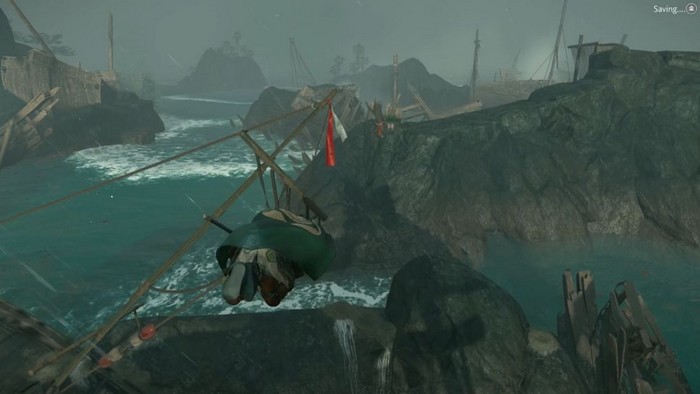 Heureusement, le chemin est assez évident ici. Sautez du premier rocher recouvert d’algues, puis passez par le grappin jusqu’au suivant. De là, sautez jusqu’à la corde qui pend du petit bateau, et faites votre chemin jusqu’au mât. Ensuite, vous avez deux autres rochers couverts d’algues à naviguer contre les vagues avant d’atteindre la terre ferme une fois de plus.