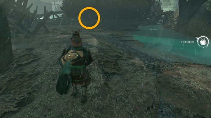 Après la section du rocher d’algues, vous vous trouverez dans un autre petit bassin d’eau. Descendez la pente, puis sautez dans l’eau pour atteindre le rocher d’en face. Traversez la poutre, mais elle s’effondrera dans l’eau. Au lieu de cela, allez à droite et il y a un affleurement rocheux qui se courbe autour de l’arrière du bateau au-dessus.