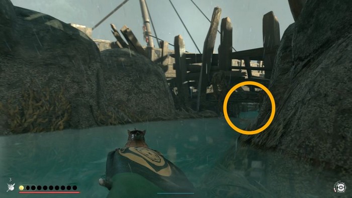 Juste devant vous, il y a une petite ouverture dans l’épave. Passez à la nage et tournez immédiatement sur votre gauche, où il y a un peu de terre sur laquelle vous pouvez vous tenir. Juste devant vous se trouve une grande épave de navire, et juste à la base de celle-ci se trouve un petit morceau de bois que vous pouvez libérer avec votre grappin.