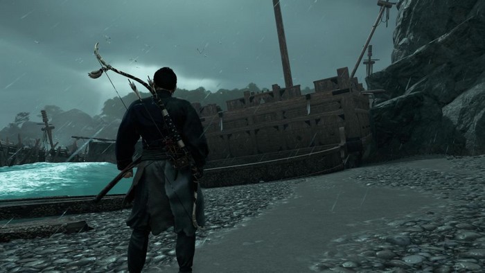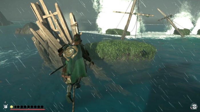 Passez par l’arrière et utilisez la corde pour atteindre le mât qui émerge de l’eau. Vous pouvez ensuite sauter de là jusqu’à un dernier rocher couvert d’algues (attention aux vagues), puis sauter pour vous grappiner dans le bateau au-dessus.