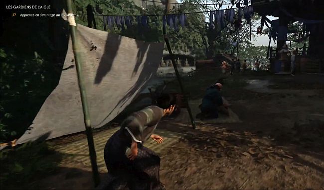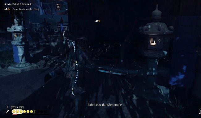 Montez le chemin de la colline à gauche du donneur de quête. Vous y trouverez un point « Observer » avec lequel vous pouvez interagir. Ensuite, vous pouvez regarder le temple et un cercle blanc vous indiquera dans quelle direction regarder. Appuyez X pour inspecter les gens près des tentes, la charrette à droite du temple, le garde devant le temple.