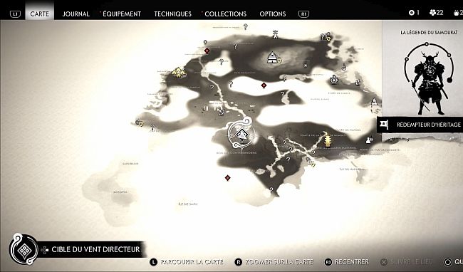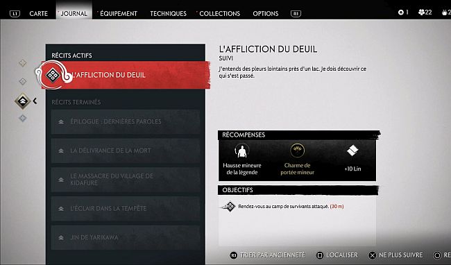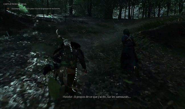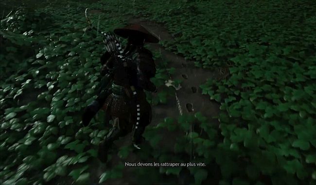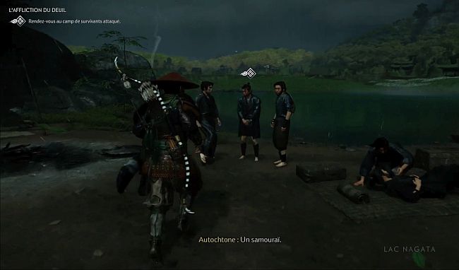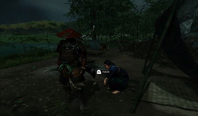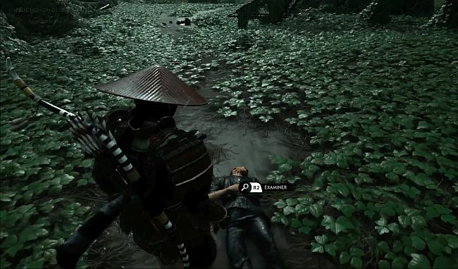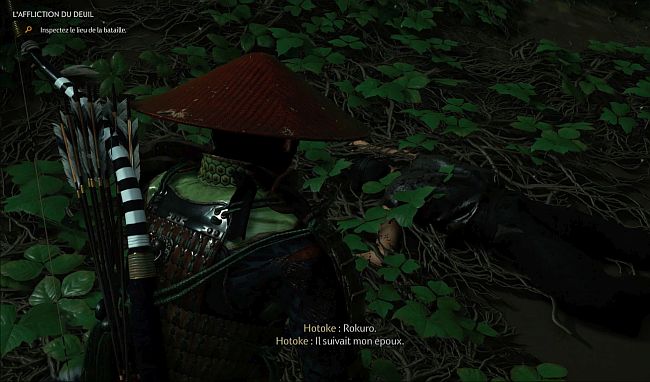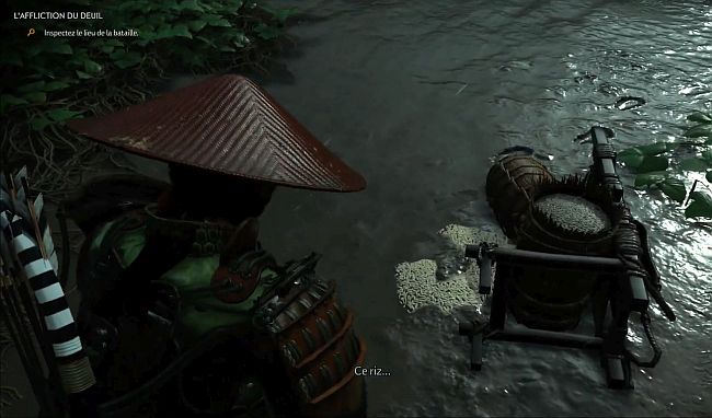 Hotoke s’arrêtera sur un site de combat où un cadavre est au sol. Suivez la piste des cadavres jusqu’à ce que vous arriviez à un sac de riz sur le petit chemin boueux (3ème image ci-dessous). Appuyez sur R2 pour l’examiner. Faites cela et vous obtiendrez un nouvel objectif pour suivre la piste du riz.