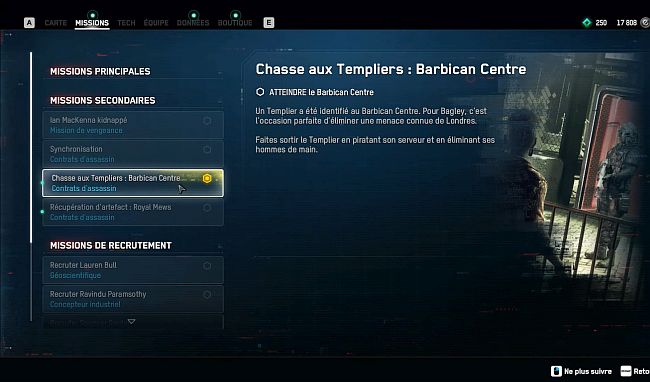 Un Templier a été identifié au Barbican Centre. Pour Bagley, c’est l’occasion parfaite d’éliminer une menace connue de Londres. Faites sortir le Templier en piratant son serveur et en éliminant ses hommes de main.