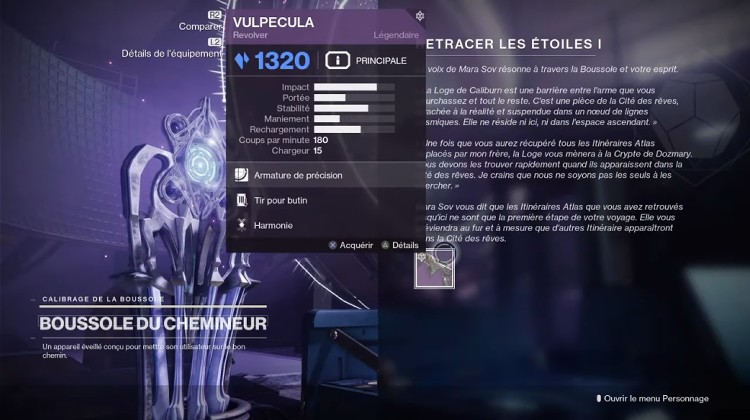 Retournez au CIMU et interagissez avec la machine de calibrage de la Boussole du Chemineur. Vous recevrez une nouvelle arme: le revolver vulpecula pour vos efforts. Ceci conclura la mission Retracer les étoiles 1.