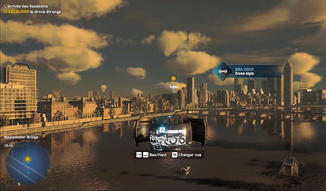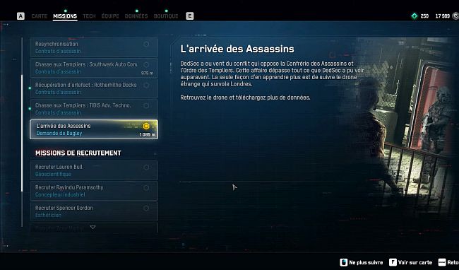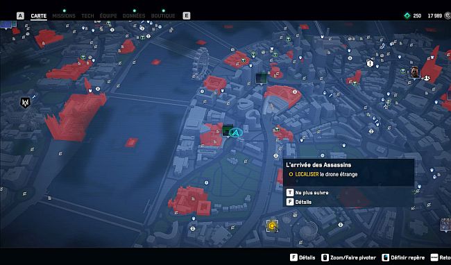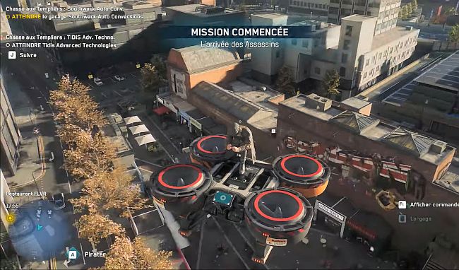 DedSec a eu vent du conflit qui oppose la Confrérie des Assassins et l’ordre des templiers. Cette affaire dépasse tout ce que DesSec a pu voir auparavant. la seule façon d’en apprendre plus est de suivre le drone étrange qui survole Londres. Retrouvez le drone et téléchargez plus e données.