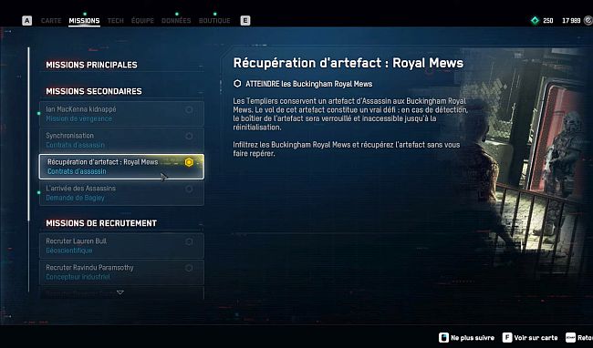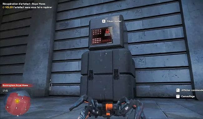 Les templiers conservent un artefact d’Assassin aux Buckingham Royal Mews. le vol de cet artefact constitue un vrai défi : en cas de détection, le boîtier de l’artefact sera verrouillé et inaccessible jusqu’à la réinitialisation. Infiltrez les Buckingham Royal Mews et récupérez l’artefact sans vous faire repérer.