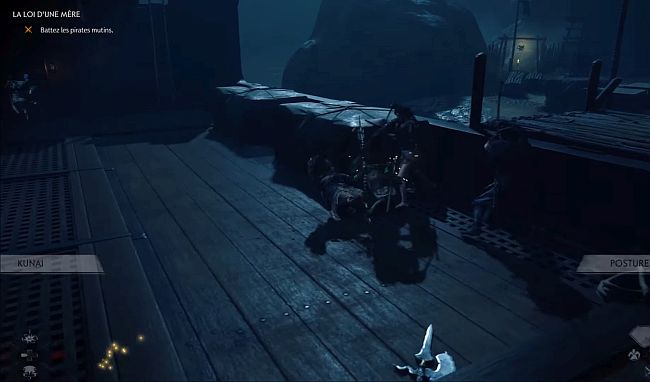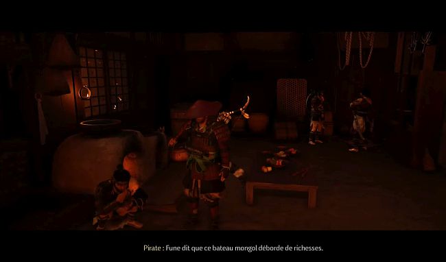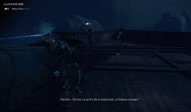 Après vous être réveillé, parlez à Fune à l’avant du navire. Ses hommes soupçonnent qu’elle ne leur dit pas la vraie raison de vouloir attaquer le navire mongol.