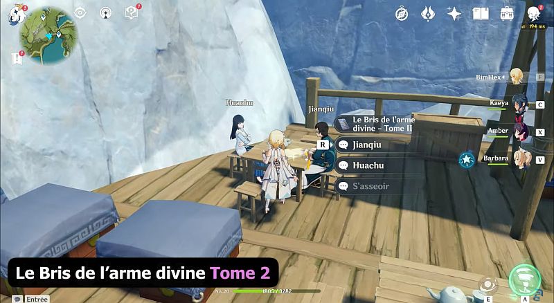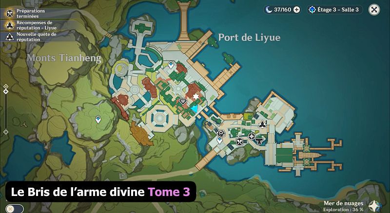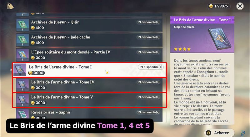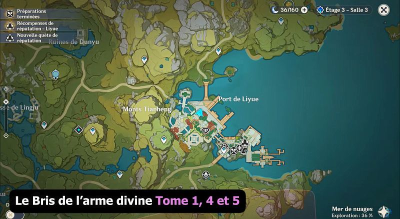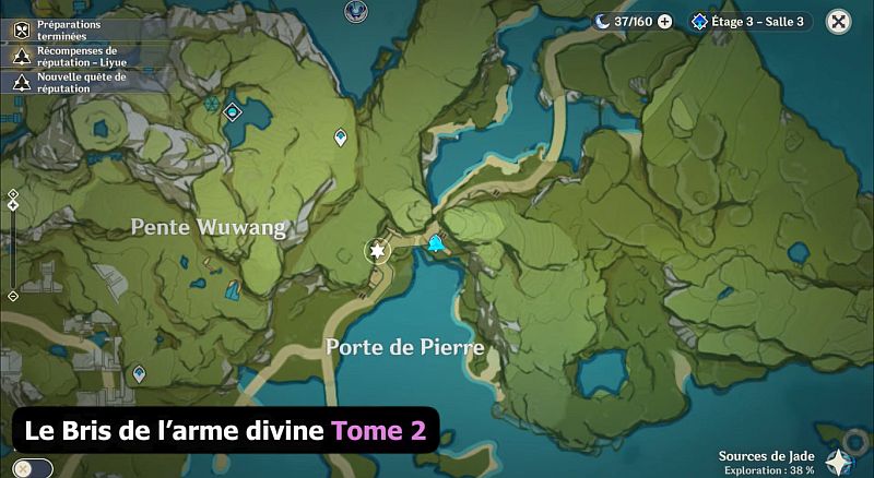 Rendez-vous à l’emplacement indiqué sur la carte ci-dessous : Le Bris de l’arme divine Tome 2 est dans la table où se trouve Huachu et Jianqiu.