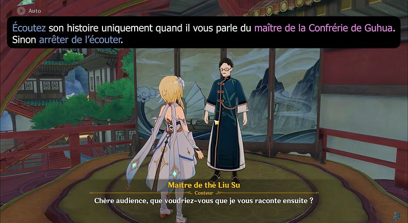 Rendez-vous à l’emplacement indiqué sur la carte ci-dessous : Parlez avec le maître de Thé Liu Su ( Écoutez son histoire uniquement quand il vous parle du maître de la Confrérie de Guhua. Sinon arrêter de l’écouter.)