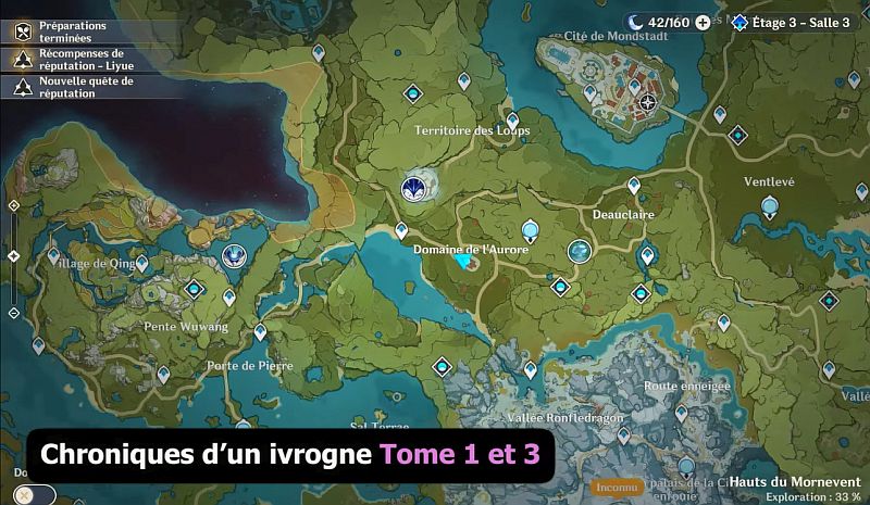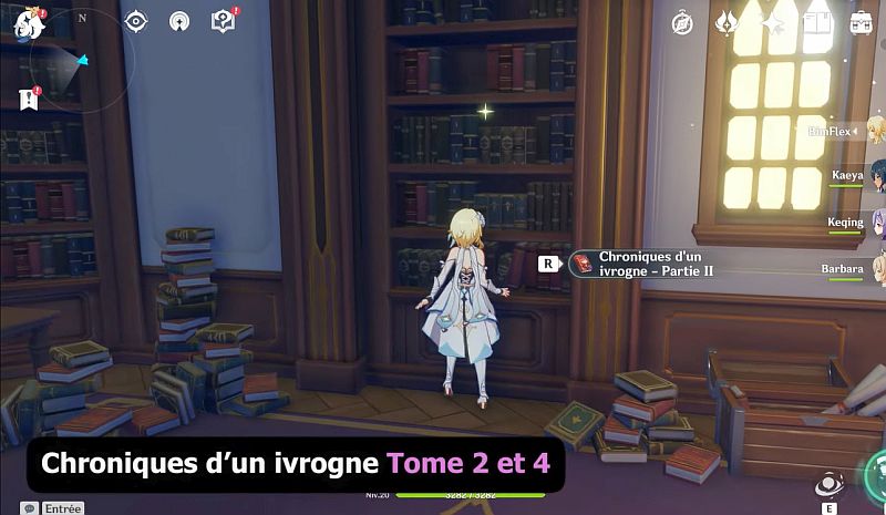Rendez-vous à l’emplacement indiqué sur la carte ci-dessous : entrez dans le QG de l’Ordre de Favonius, ouvrez la première porte à droite : Les Chroniques d’un ivrogne II est dans la bibliothèque à droite, Les Chroniques d’un ivrogne IV sont dans le niveau inférieur dans une bibliothèque murale.